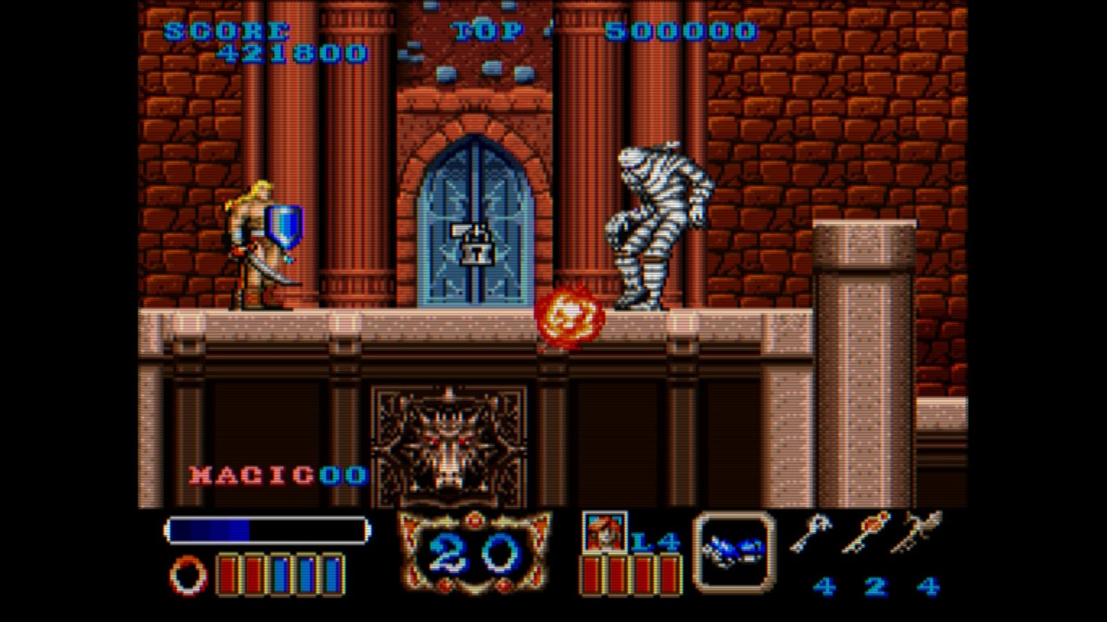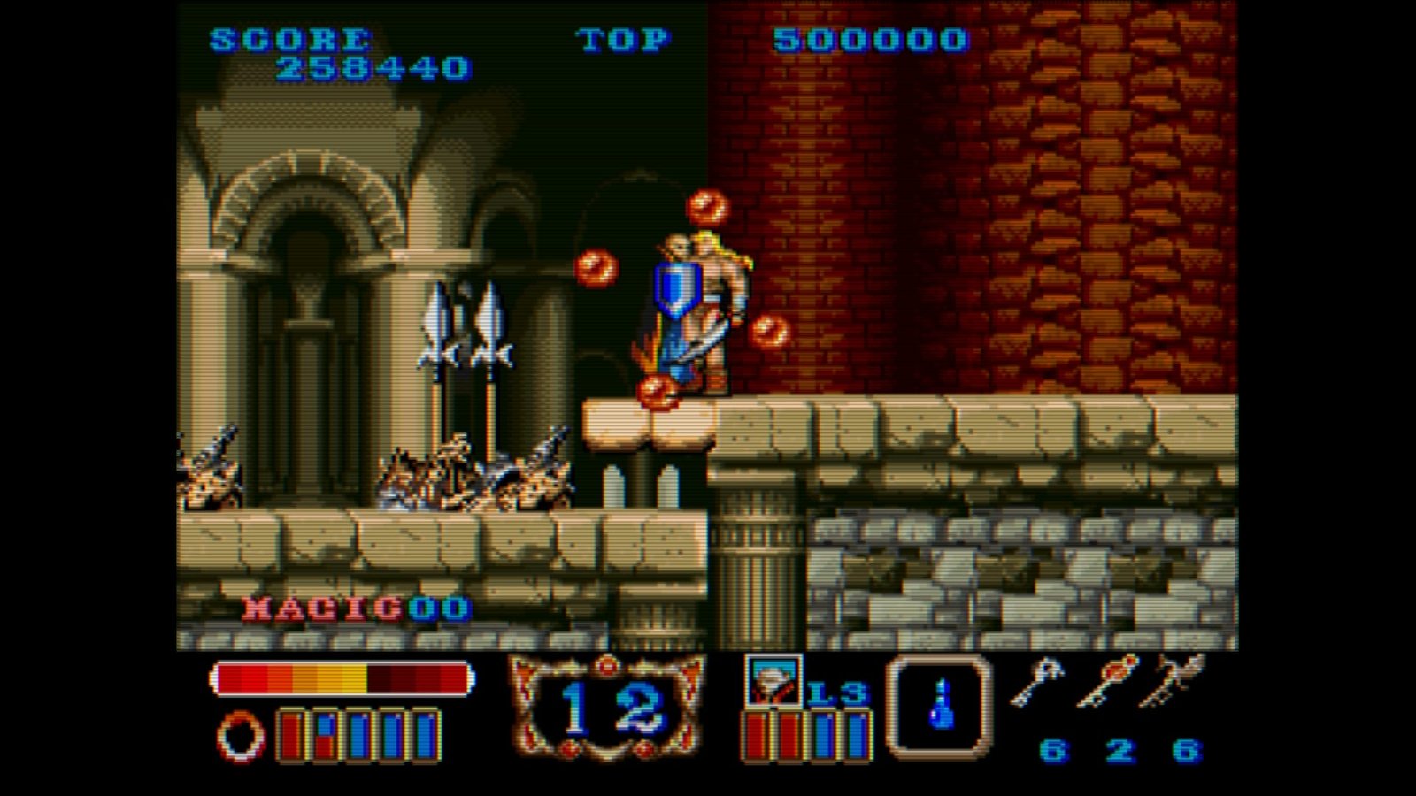 صعوبة Magic Sword ترتفع كلما تقدمت طبعًا، لكن ومن البداية ستجد أنواعًا مختلفة من الأعداء، أحجامهم تختلف كذلك وهجماتهم، يمكنك أن تضرب قذائفهم لتتخلص منها أو تنحني وهكذا ستستخدم الدرع دُون تلقي ضرر، بعض الأعداء أحجامهم صغيرة ويهاجمون على شكل أسراب كالخفافيش، لكن مُجددًا، لا شيء يستدعي منك ردات فعلٍ خارقة، اللعبة تعطيك مساحة كافية لتنتبه للعدو وتقضي عليه، وإنْ وجدت نفسك عالقًا، يمكنك التضحية بجزء من عداد حياتك لإطلاق ضربة خاصة تُخلص من الأعداء من حولك.